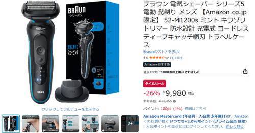 Braunの電気シェーバー「シリーズ5 52-M1200s」が、Amazonタイムセール対象です。参考価格13,455円のところ、26%オフの9,980円で販売されています。