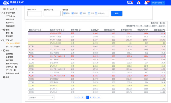 渡辺電機の顧客の8~9割は製造業だが、近年は全国展開している店舗からの引き合いも増えているという。とある家電量販店では、全国に展開する約150店舗に導入され、各店舗の電力デマンド監視や、空調設備などの使用電力量を一括で管理している。30分間の最大使用電力量を基準に料金が決まるデマンドの特性を踏まえ、クラウド上でデータを確認できる仕組みが構築されている。