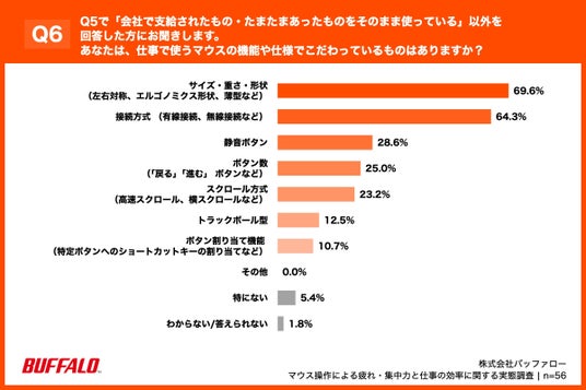 あなたは、仕事で使うマウスの機能や仕様でこだわっているものはありますか?(複数回答)」(n=56)と質問したところ、