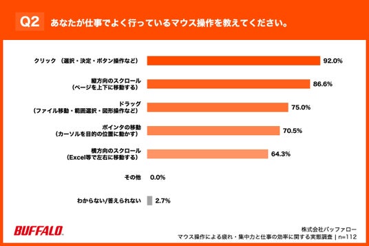 「Q2. あなたが仕事でよく行っているマウス操作を教えてください。(複数回答)」(n=112)と質問したところ、