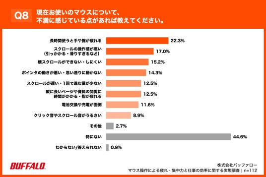 「Q8. 現在お使いのマウスについて、不満に感じている点があれば教えてください。(複数回答)」(n=112)と質問したところ、