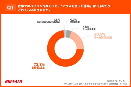 株式会社バッファロー(本社:東京都千代田区、代表取締役 社長執行役員CEO:牧 寛之、以下バッファロー)は、1日6時間以上パソコンを使用し、パソコン操作にマウスを使用している会社員・公務員112名を対象に、マウス操作による疲れ・集中力と仕事の効率に関する実態調査を実施しましたので、お知らせいたします。