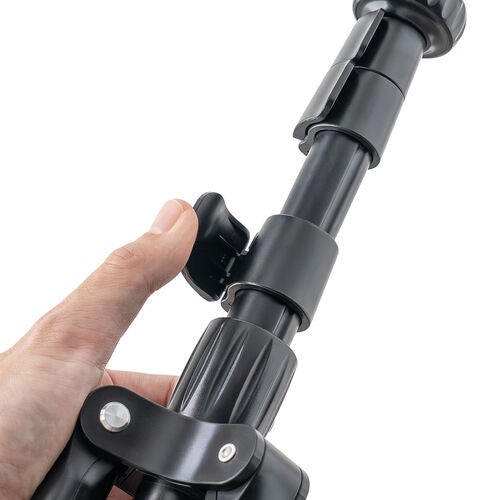 本製品最大の特長は、中央の支柱を押し下げるだけで3本の脚が同時に展開する独自の自動開脚機構である。一般的な三脚のように脚を一本ずつ手で広げる手間が一切なく、ワンタッチに近い感覚で撮影体制を整えられる。シャッターチャンスを逃したくない屋外撮影や、急なWeb会議での設置・撤収において圧倒的なスピードを実現する。
