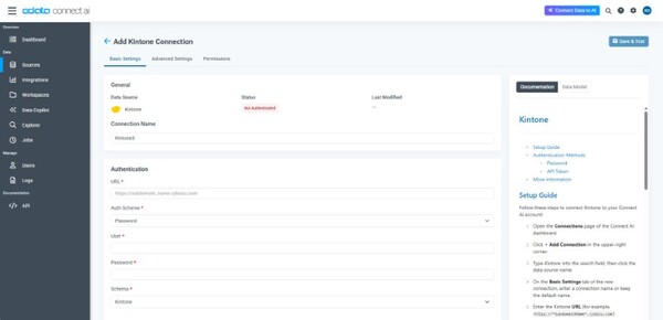 「Sources」タブで「+ Add Connection」をクリックして「kintone」を選択して、kintoneへの接続設定を行います。