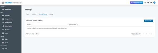 「Settings」画面の「Access Tokens」タブが選択された画面が表示されるので「+ Create PAT」をクリックします。