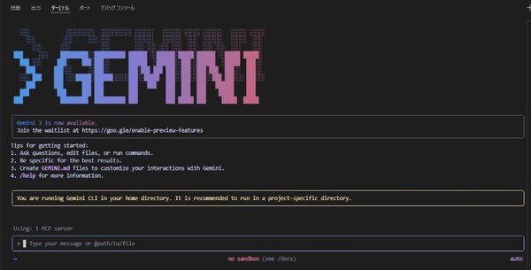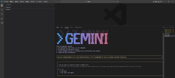 ※グローバルインストールすることで、VS Codeのどのワークスペースからでもgeminiコマンドが利用可能になります。