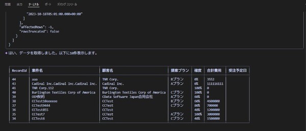 例として「Kintone-Demo-Salesから案件管理(営業支援パック)のデータを取得して10件一覧表にして」と入力してみます。