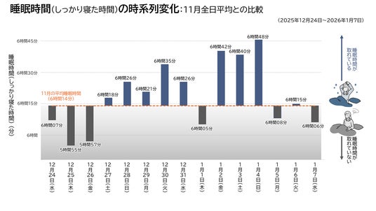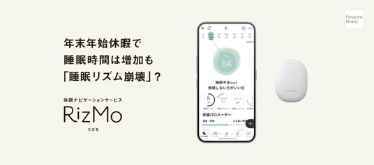 パナソニック株式会社は、体調ナビゲーションサービス 「RizMo(リズモ)」(以下 リズモ)のユーザー567名を対象に、年末年始(12月24日~1月7日)の睡眠データを調査し、生活者の睡眠傾向を分析しました。その結果、年末年始は睡眠時間が増える一方、睡眠リズムが乱れやすくなるという特徴が明らかになりました。