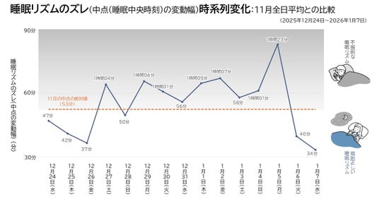 特に注目されるのが、休暇明けの 1月5日に睡眠リズムの変動幅が最大となる点です。これは、休暇中に増加した睡眠時間や、乱れた就寝時刻・起床時刻が、仕事始めを迎えた瞬間に急激に調整され、体内時計に大きな負荷がかかっている状態を示しています。
