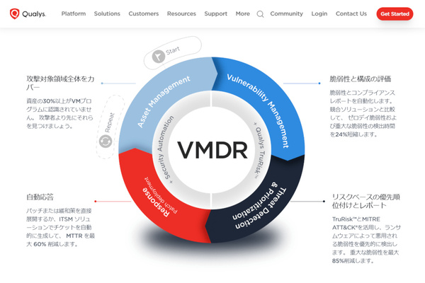 ASMと脆弱性管理ツールの統合製品もある。Qualysの脆弱性管理/評価製品「VMDR」では、独自のリスクスコア分析(脆弱性の深刻度、悪用可能性、保護資産の重要性など)から対応の優先順位付けまでを行う(画像出典:Qualys)