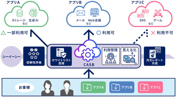 シーイーシーの「クラウドアプリ信頼性評価」は、CASBを介して社内のシャドーIT利用を検出するとともに、各SaaSの信頼性評価や、ホワイトリスト型の利用制限を行うサービスだ(画像出典:シーイーシー)
