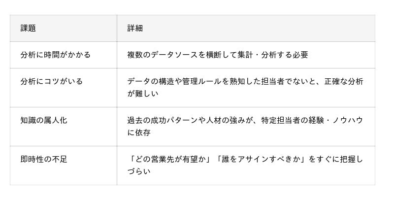 ドリームキャリアでは、SES(システムエンジニアリングサービス)事業において9年分の営業データを蓄積・活用してきましたが、以下の課題が顕在化していました。