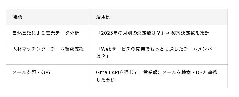 意思決定の効率化: チーム編成や営業先選定の判断材料を、担当者に確認せずAIから取得可能