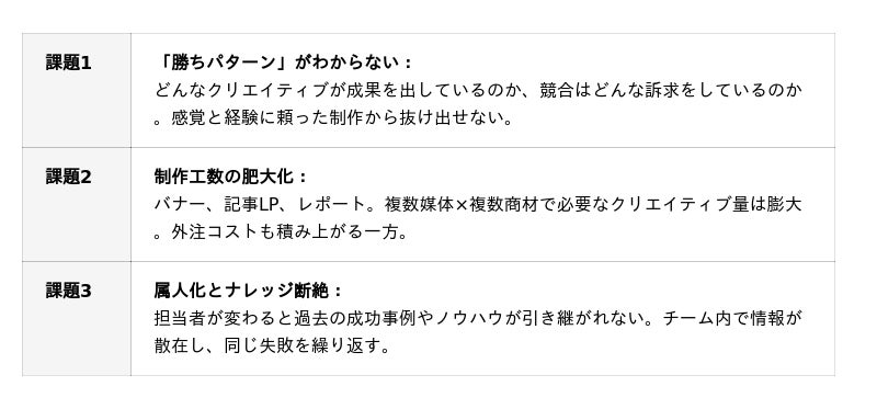 ■ 開発の背景:広告クリエイティブ制作の現場が抱える3つの課題