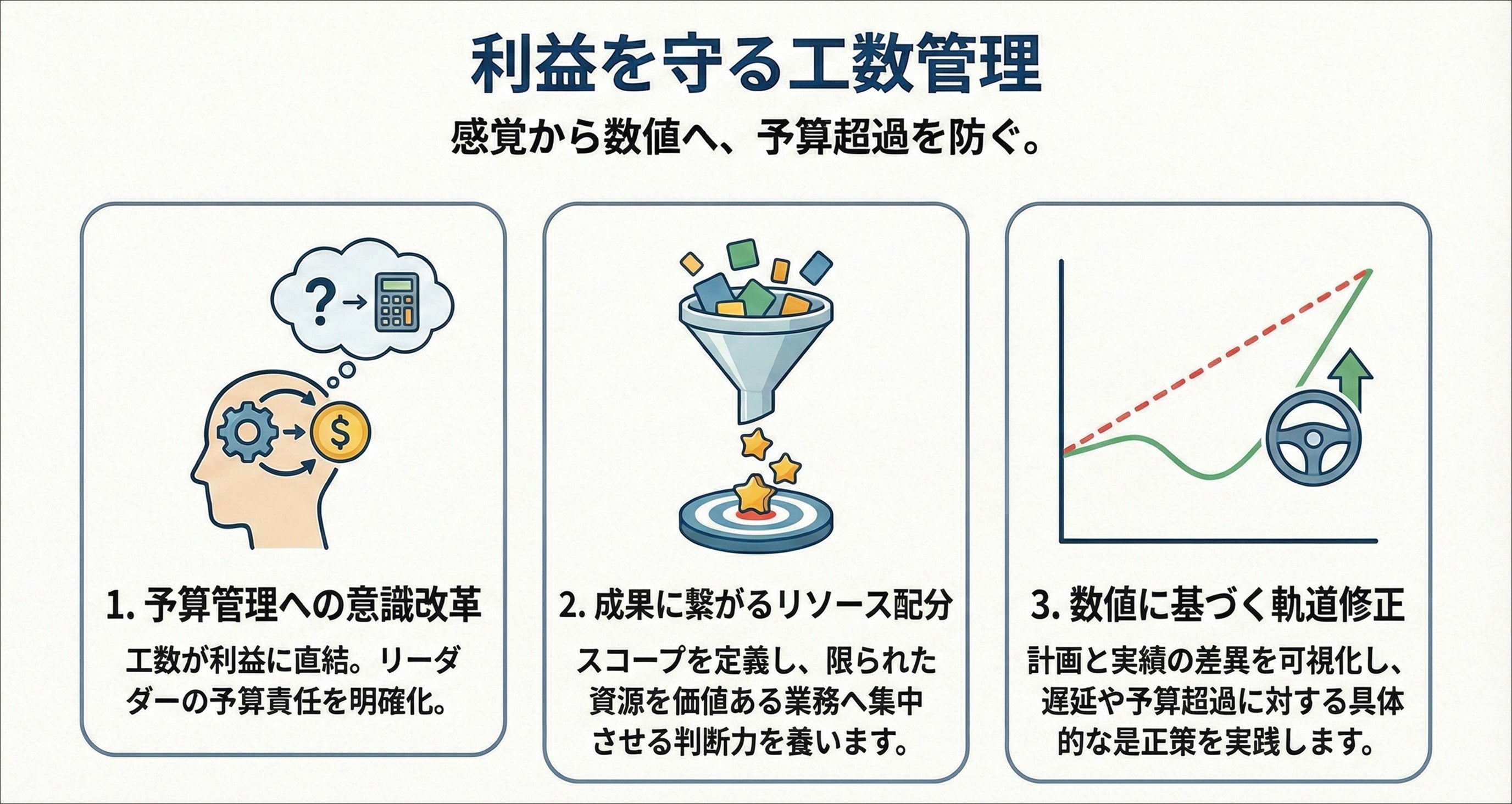 工数が利益に直結する理由を明確にし、案件リーダーとしての予算管理責任を再確認します。