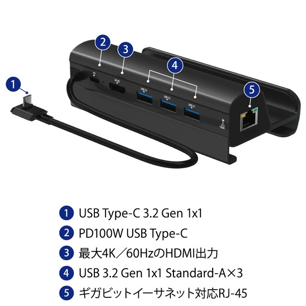 「USB-CDKG01」は、USB 3.2 Gen 1のUSB Type-A端子×3基に加えて最大100W給電可能なUSB PD対応USB-Cを搭載。ホスト側のUSB-CはUSB 3.2 Gen 1対応で、据え置きでゲーミングUMPCをUSB充電しながら、多種多様なUSB機器を接続できる。