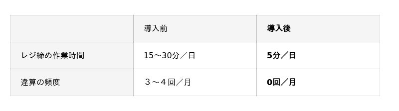 本導入により、スタッフのレジ締め時間は従来の3分の1に短縮され、違算は0件となるなど、会計業務の大幅な効率化を実現しています。