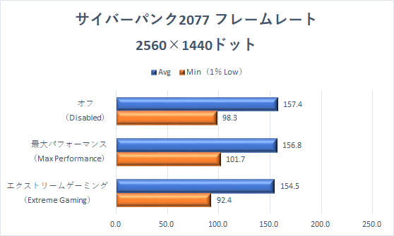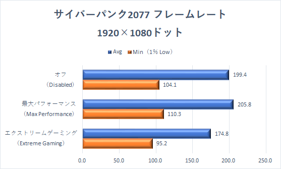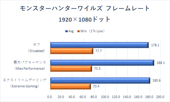 ここまで何度かみてきた、最大パフォーマンス>オフ>エクストリームゲーミングモードという序列となっている。とくにフルHD解像度、エクストリームゲーミングモード時のフレームレート落ち込みは大きい。