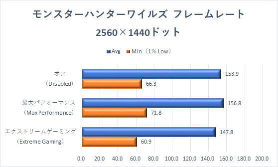 「モンスターハンターワイルズ」も、わずかだがエクストリームゲーミングモードがフレームレートを伸ばす傾向となっている。