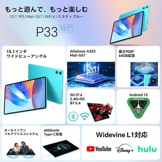 【10.1インチ画面 & Widevine L1対応】P33タブレットは10.1インチの高精細画面を採用し、1280×800の最適化された解像度を実現しています。ウェブブラウジング、電子書籍の読書、動画視聴のいずれにおいても、文字の細部まで鮮明に、色鮮やかに再現します。