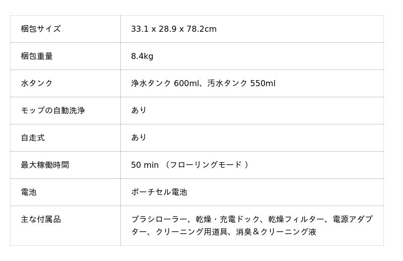 本製品は本体重量わずか3.5kgで、使用時の体感重量は約0.79kgです。一方、取り回しが簡単で、省スペース収納も可能です。吸引と水拭きを一台でこなすスマート機能に加え、絡み防止のローラーブラシやセルフクリーニングシステムを搭載し、家具下や狭い場所の清掃も快適に行えます。