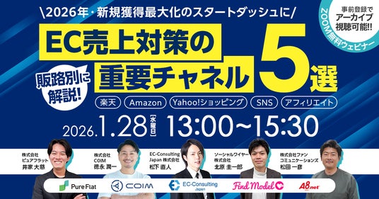 楽天市場・Amazon・Yahoo!ショッピング・SNS・アフィリエイトといった主要ECチャネルを横断的に解説する無料オンラインセミナー「販路別に解説!EC売上対策の重要チャネル5選」を、2026年1月28日(水)に開催いたします。