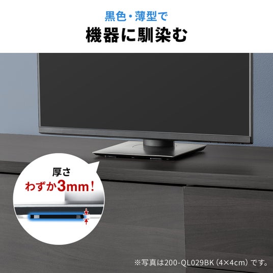 厚さわずか3mmの薄型設計で、機器の印象を損ないにくいのが特長です。ブラックカラーなので脚部や底面になじみやすく、設置後も目立ちにくい仕上がりに。リビングやデスク周りでも景観を崩さず使えます。