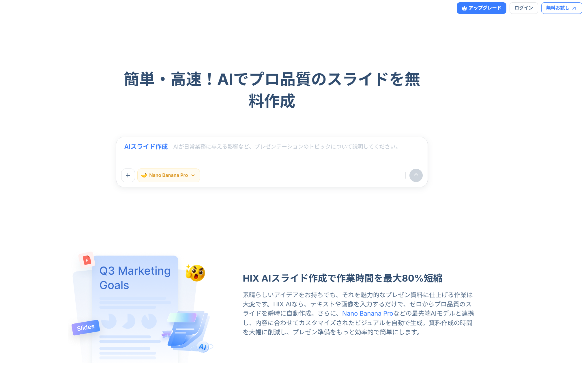 HIX AIのスライド作成AIは、ユーザーが入力したテーマ・アウトライン・文章から、自動で高品質なプレゼン資料やスライドを生成できます。従来の手作業によるスライド作成時間を大幅に削減できるだけでなく、デザインスキルがなくてもプロ品質の資料を即時に作成できる点が特長です。また、情報の構造化、専門用語の理解に対応し、複雑な概念を論理的な図解・ビジュアル表現に変換可能です。出典リンク付きで明確な参考情報も提供します。
