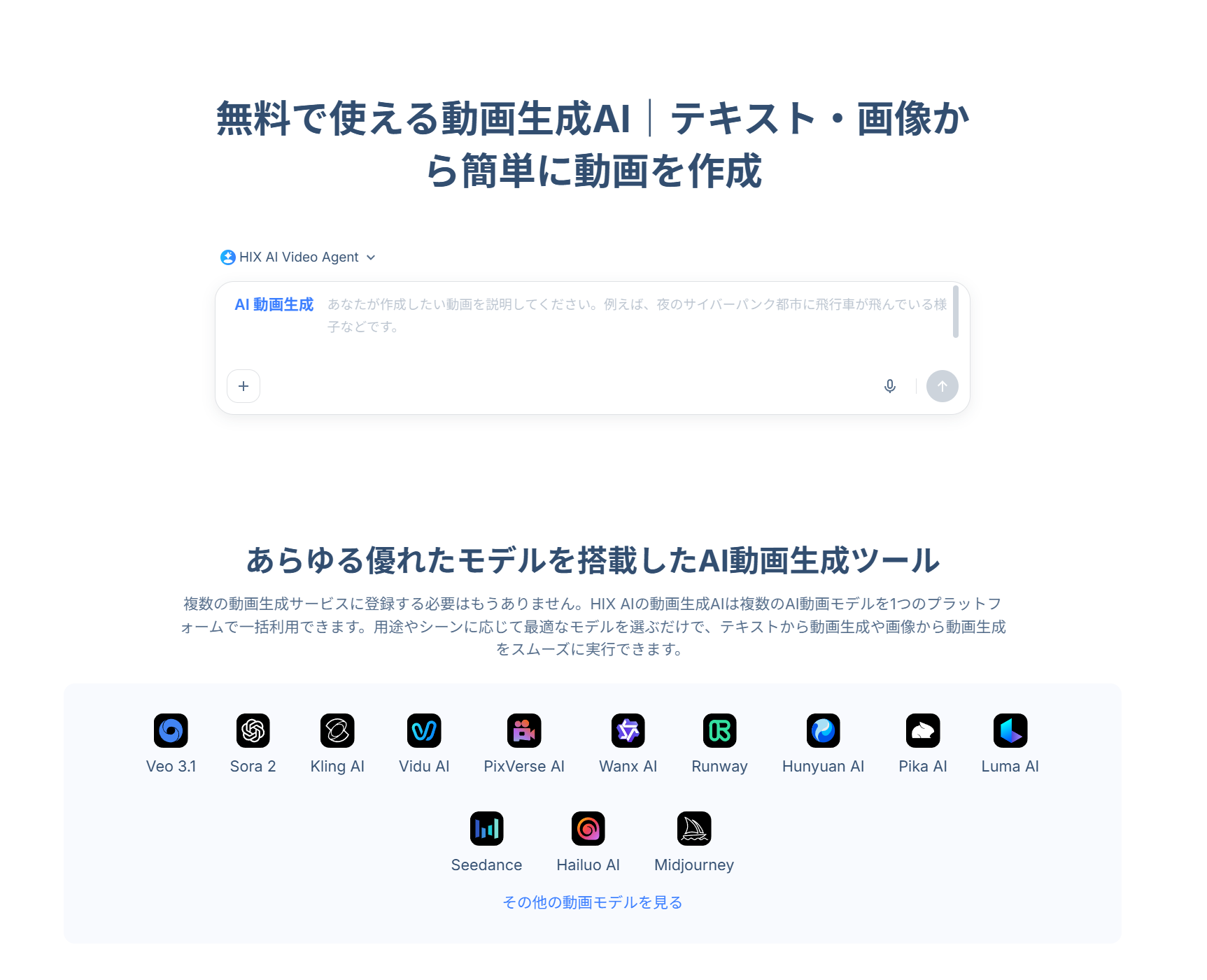HIX AIの動画生成AIはSora、Veo、Kling AI、Runwayなど、最先端の動画モデルを搭載し、テキスト・画像から簡単に動画を作成できるサービスです。専門的な設定やモデル選びは不要で、動画の目的・内容・スタイルに応じて、最適な動画生成AIを自動で使用します。