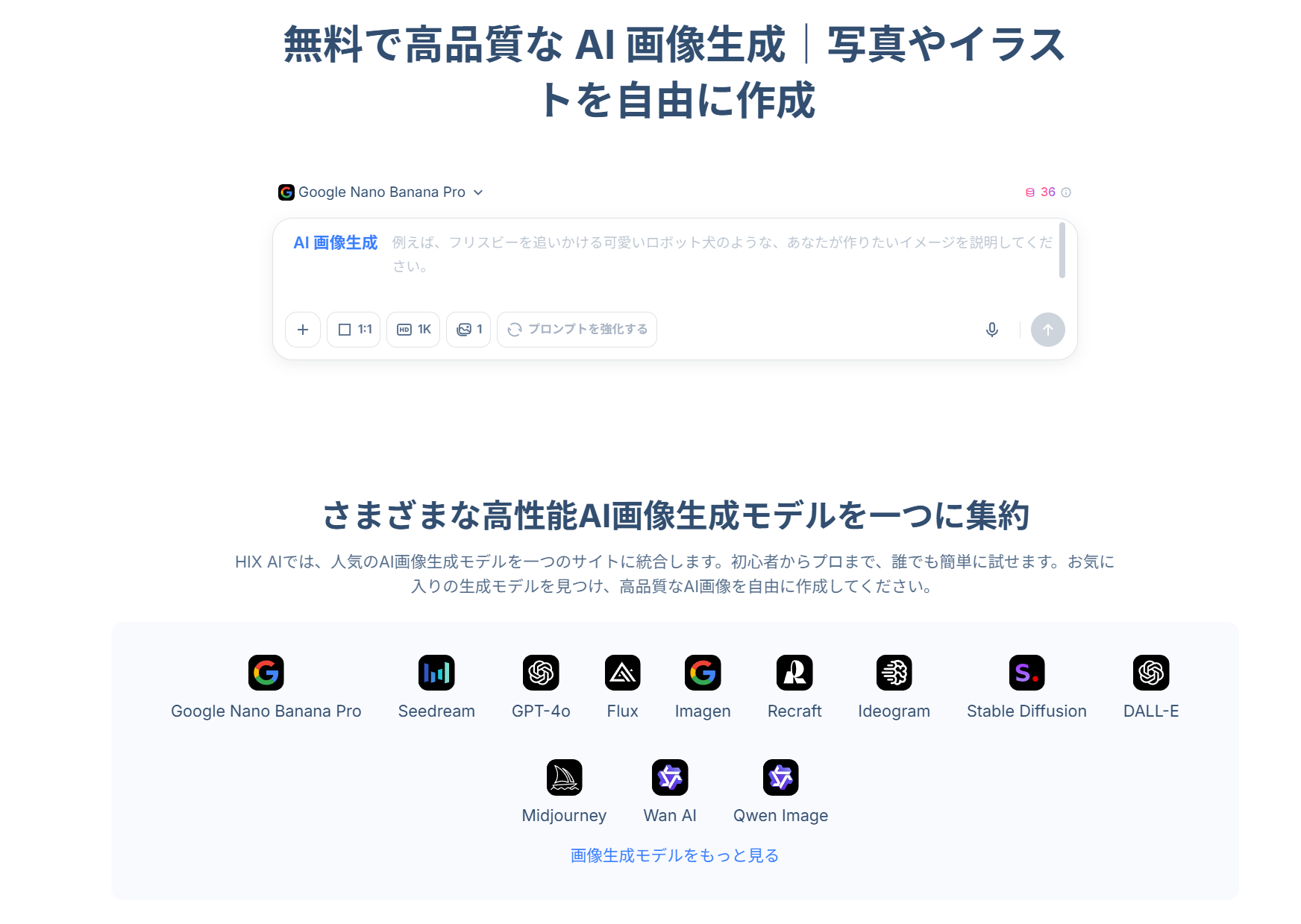 HIX AIのAI画像生成機能は、テキストプロンプトや参考画像を入力するだけで、高精細・高品質な画像を自動生成できる生成AIサービスです。ブログ記事用のアイキャッチ、SNS投稿用素材、広告バナー、プレゼン資料用イメージなど、あらゆるビジュアルコンテンツ制作に対応しています。