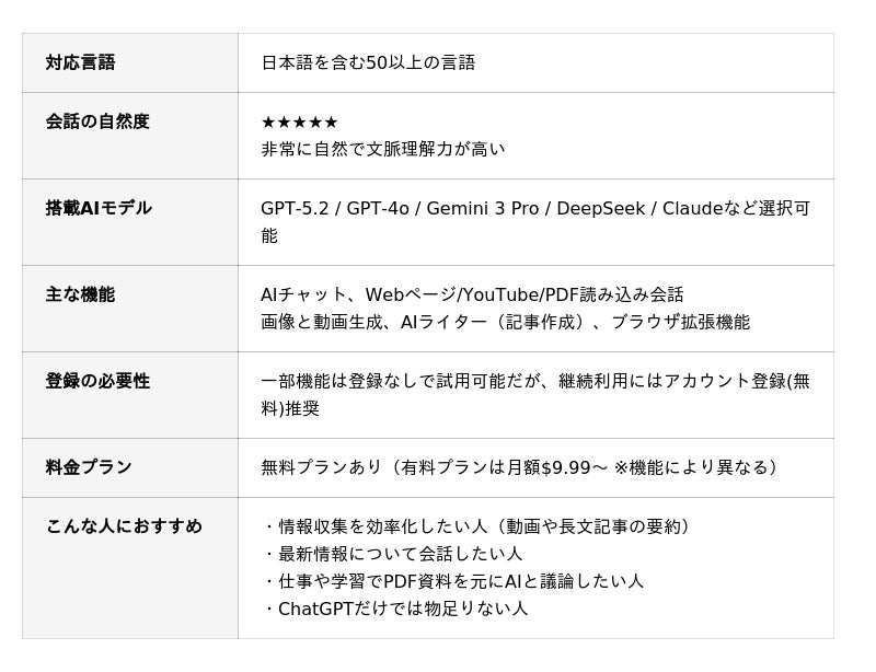 Gemini 3 Flash 、 GPT-5.2 Pro 、 DeepSeek-V3.2 、Claude Sonnet 4.5 、Haiku 4.5 、Opus 4.5など高精度の生成AIモデルを搭載しており、日本語での質問・相談に対しても自然で分かりやすい返答を生成できます。