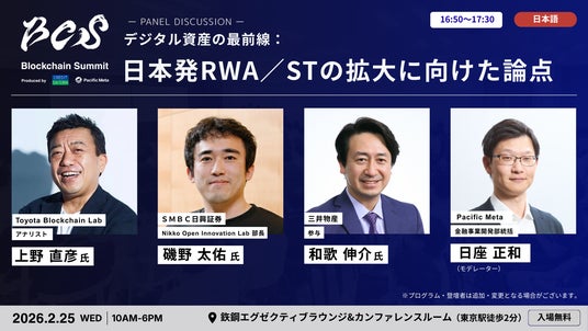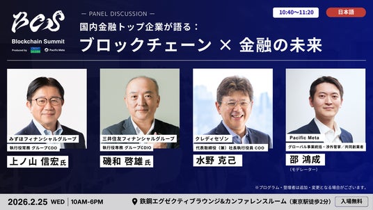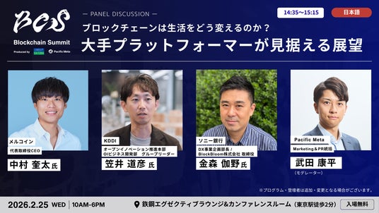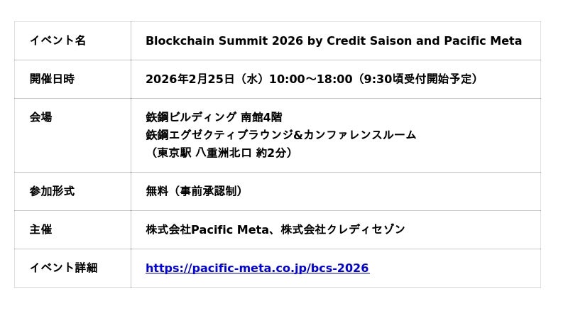 株式会社Pacific Meta(本社:東京都港区、代表取締役:岩崎 翔太、以下「Pacific Meta」)と株式会社クレディセゾン(本社:東京都豊島区、代表取締役(兼)社長執行役員 COO:水野 克己、以下「クレディセゾン」)は、2026年2月25日(水)に開催するブロックチェーンに関する国際カンファレンス「Blockchain Summit 2026 by Credit Saison and Pacific Meta」(以下「本イベント」)において、第一弾となる登壇者・セッション情報を発表いたします。