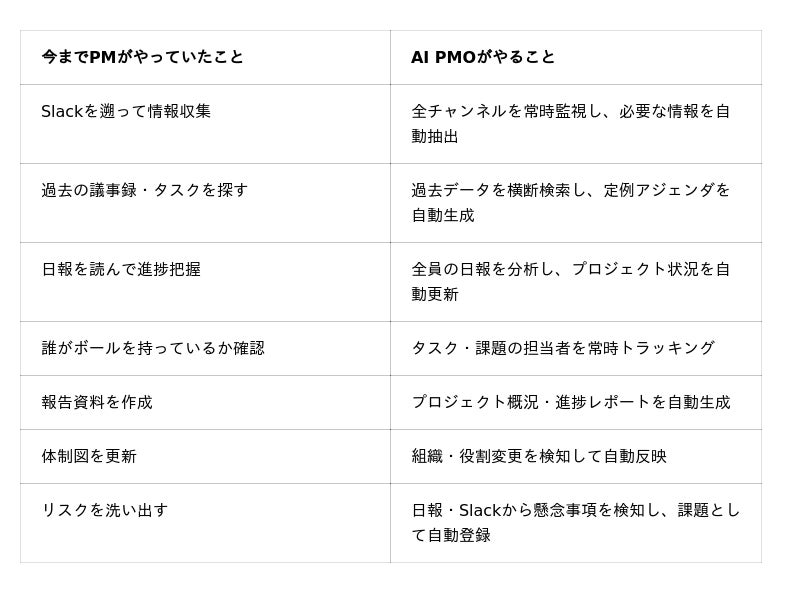 AI PMOが周辺業務を引き受けることで、PMは「本当に価値のある仕事」に集中できます:
