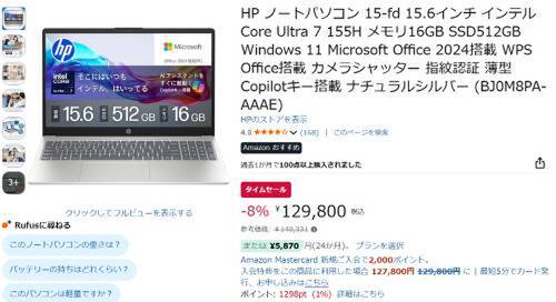 HPの15.6型ノートPC「HP 15-fd(BJ0M8PA-AAAE)」が、Amazonのタイムセール対象です。参考価格140,331円のところ、8%オフの129,800円で販売されています。