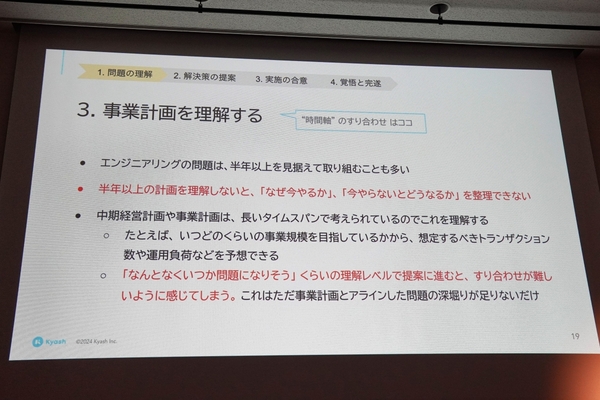 3つ目は「事業計画を理解する」ことだ。エンジニアリングの問題は、改善までに半年以上かかることが多く、同じくらい先の事業計画を理解しないと「なぜ今やるか」「今やらないとどうなるか」を整理できないからだという。