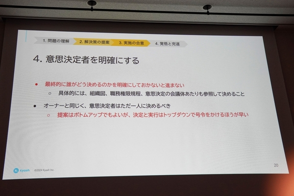 4つ目に挙げたのが「意思決定者を明確にする」である。改善の動きを止めてしまわないよう、組織図や職務権限規程、意思決定の会議体などを参照して最終決定者をはっきりさせる。