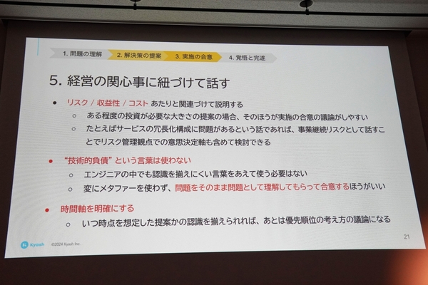 例えば、データベースの冗長化構成に問題があれば、事業継続リスクとして話すことで、意思決定の軸が定まる。こにふぁーさんが気を付けているのが「技術的負債」という言葉は使わないことだ。それは、エンジニアの中でも認識が揃っていない言葉だからであり、「変にメタファーを使わず、問題をそのまま問題として理解してもらい、合意する方がよい」と語る。