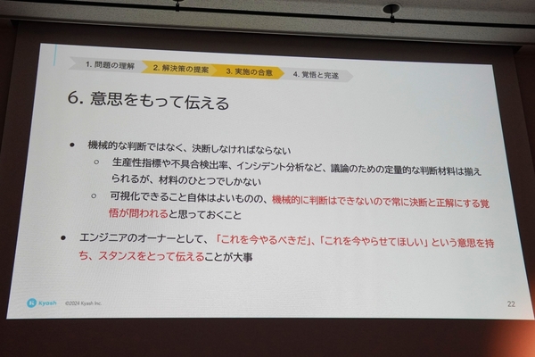 機械的な判断ではなく、決断しなければならない場面においては、生産性指標や不具合検出率、インシデント分析などをいくら揃えても、材料のひとつにしかならない。最終的には「これを今やるべきだ」「これを今やらせて欲しい」というアイ(I・私)メッセージを伝えることが、オーナーとしての振る舞いになる。