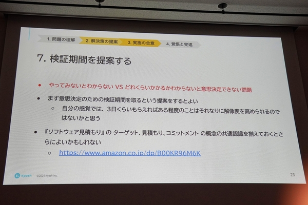 これは、「やってみないとわからない」VS「どれくらいかかるかわからないと意思決定できない」という問題に対する、「まずは、意思決定のための検証期間を設けましょう」という提案である。こにふぁーさんの感覚では、3日間くらいの検証期間を設けるだけで、それなりに解像度を高められるという。