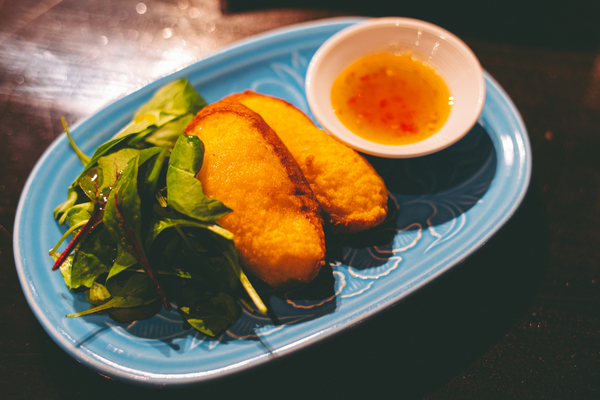 続いて登場したのが、店員さんおすすめの「ベトナム海老トースト」海老のすり身をパンに塗ってサクサクに揚げられた、ベトナムではお馴染みの料理なんだそう。揚げたてアツアツの海老トーストは、見た目は小ぶりながら黄金色にこんがりと揚がっていて、運ばれてきた瞬間から漂う香ばしい香りに期待が高まります…! ひと口かじると、外側はザクザク、ガリガリとした心地よい歯ごたえ。油っこさはなく驚くほど軽やかで、噛むたびに海老の濃厚な旨味と香ばしい揚げパンの香りが口いっぱいに広がります。添えてあったスイートチリソースにつければ甘辛い風味が加わり、これまた絶品! 推しメニュー見つけちゃったかも…!