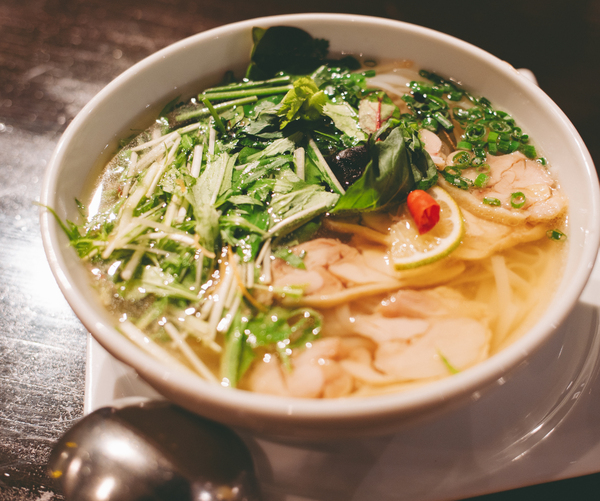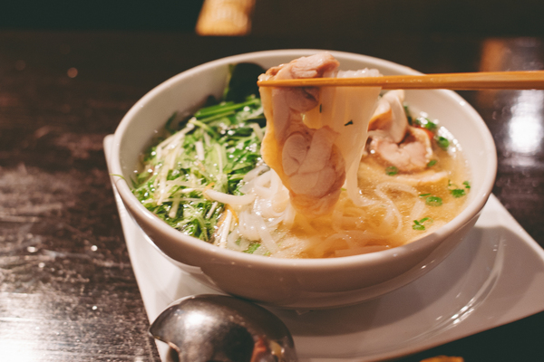 たっぷり前菜とサラダを楽しんだ後のメインに選んだのは、「蒸し鶏のフォー」。澄んだスープの中には平打ちの米粉麺が泳ぎ、柔らかく蒸した鶏むね肉がたっぷりとトッピングされています。レンゲでスープをひと口すすれば、透き通った鶏ガラスープに蒸し鶏の旨みがじんわり溶け込み、ふわりと爽やかなライムの香りが上品。蒸し鶏は歯がいらないと言いたくなるほどしっとり柔らかく、スープとの一体感も抜群です。ライムや唐辛子ペーストなど味変も自在で、飲み干したいほど病みつきに。エキゾチックな店内で味わうのもまた格別で、体の芯からほっと癒やされました…!