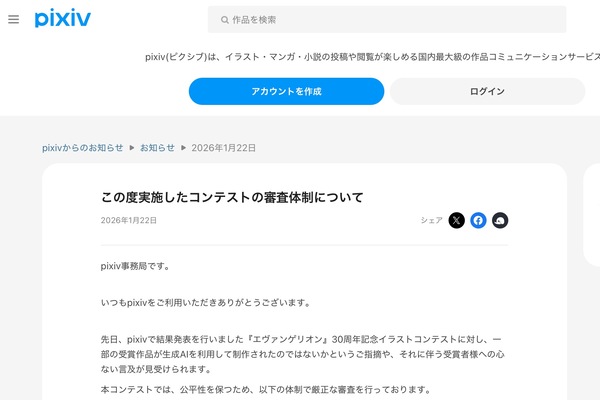 pixiv事務局は1月22日、同社が主催した「エヴァンゲリオン」30周年記念イラストコンテストの審査体制について、公式に説明した。結果発表後に一部の受賞作品について「生成AIを使って制作されたのではないか」との指摘が相次ぎ、受賞者に対する心ない言及が見られたことを受けたもの。