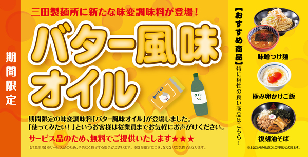 三田製麺所は1月13日より新たな味変調味料「バター風味オイル」の提供を開始した。