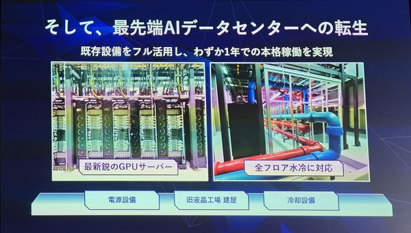 AIデータセンターは、2024年8月に役目を終えたシャープ堺工場の跡地を活用して構築されました。大規模な電力設備や冷却設備といった貴重なアセットを継承し、わずか1年足らずという驚異的なスピードで完成を迎えたと言います。