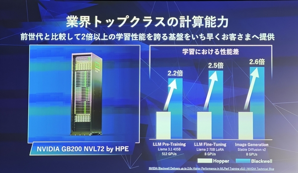 最新GPUであるNVIDIAのBlackwell世代(NVIDIA GB200 NVL72)のサーバーを導入し、国内でも非常に早いタイミングで高度な計算基盤を実現しています。そして、従来の空冷方式と比較して、15倍もの冷却能力を持つ「直接液体冷却(水冷方式)」という革新的な冷却システムを採用しました。