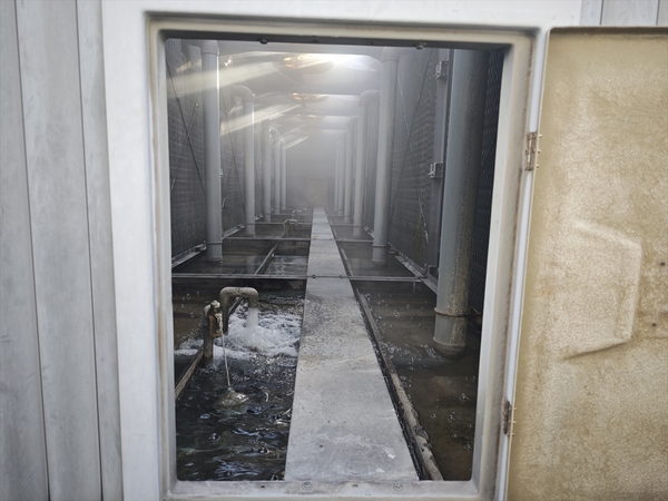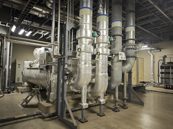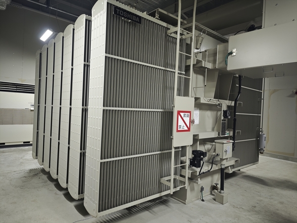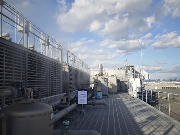 別名クーリングタワーと呼ばれる設備で、ターボ冷凍機ではっせいした熱を大気中に放出する役割を担っています。温度が上昇した冷却水を、水が気化する際の気化熱を利用して冷やします。温度が下がった冷却水は再びターボ冷凍機に戻って、データセンター全体の冷却を支えています。