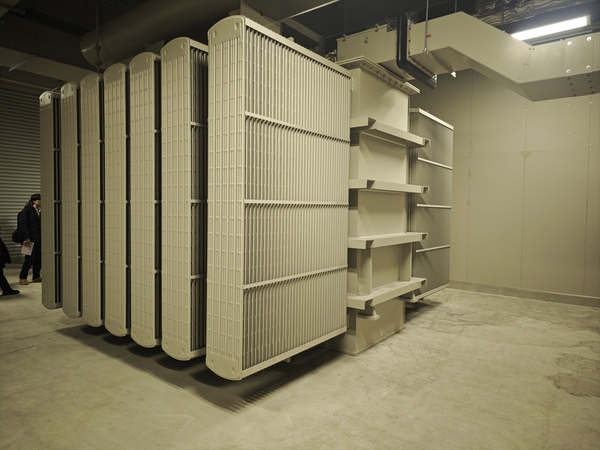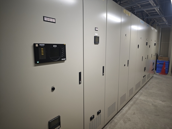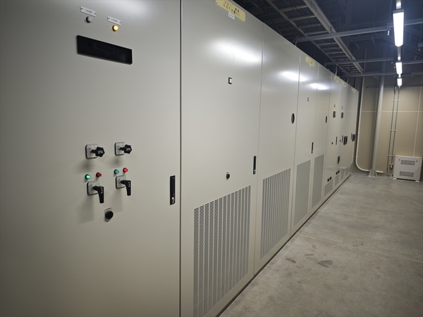 電力会社から共有される高電圧ので電気をデータセンター内で使用できる電圧に変換するための設備。基本的に外部から受電した電力はそのままでは使えないので、この設備が必要になります。この変圧器をイチから作ると設置まで3年はかかるとのことですが、シャープの工場から引き継いだので、すぐに使えたそうです。このようにシャープから流用しているものがいたるところにあるのです。