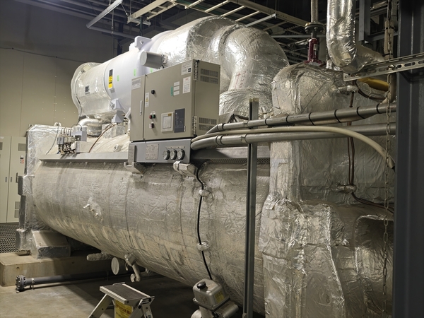 データセンターのキモとも言えるのが、このターボ冷凍機です。サーバールームの空調だけでなく、GPUをはじめとした高発熱機器の冷却に使われています。タービンで圧縮した冷媒ガスを、屋上の冷却塔からの冷却水で液化させ、液化した冷媒が気化する熱を利用して冷水を生成する仕組みです。ターボ冷凍機で20度以下になった冷却水は、回り回って戻って来る頃には30度以上になっているとのこと。