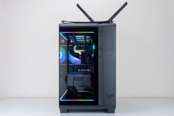 今回の企画にあたり、「TUF Gaming」シリーズのパーツに絞ってマシンを構築した。ケースには開放的な視界で流行りのフレームレス「TUF Gaming GT502 Horizon」を使用。マシンの心臓部には最新のIntel Core Ultra 9 285Kを採用し、マザーボードには「TUF GAMING Z890-PLUS WIFI」を選択。ビデオカードは「TUF-RTX5070-O12G-GAMING」を、電源ユニットは「TUF-GAMING-850G」を組み込んだ。
