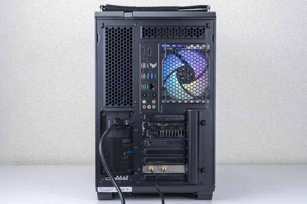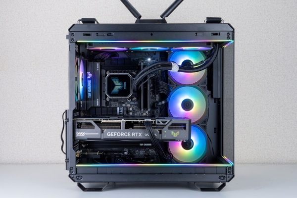 さらに、CPUの冷却性能と視覚効果を両立させるため、360mmラジエーターとLCDパネルを備えた簡易水冷クーラー「TUF GAMING LC III 360 ARGB LCD」を導入。内部には120mmのケースファン「TUF GAMING TR120 FAN ARGB REVERSE BLACK 3IN1」と「TUF GAMING TR120 FAN ARGB BLACK 3IN1」から計4基配置し、加えてガラス面の上下にライティングキット「GT502 Horizon ARGB Lighting Kit BLK」を装着して彩りを添えている。